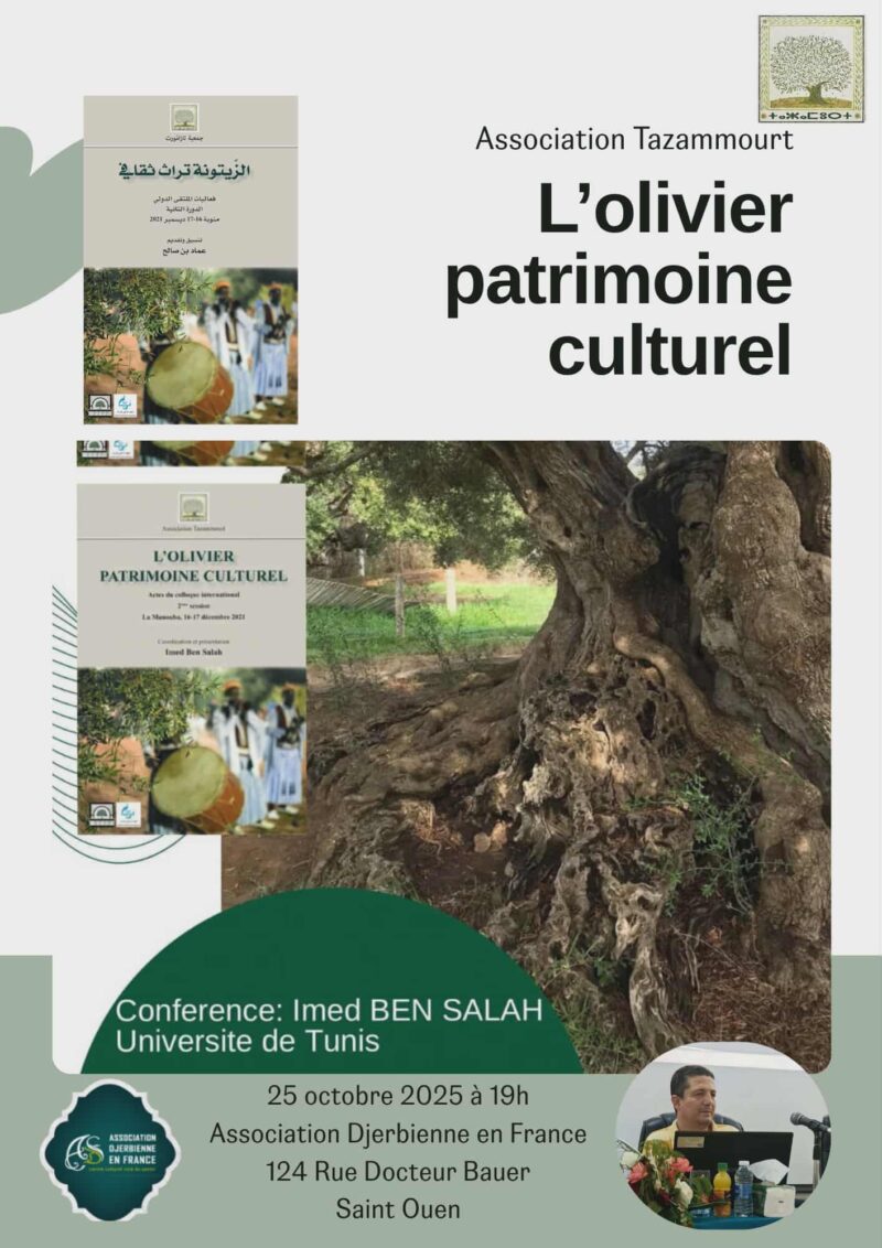 بالتعاون مع الجمعية الجربية بفرنسا، تنظم جمعية تازامورت أمسية ثقافية يؤثثها الاستاذ عماد بن صالح. في البرنامج محاضرة بعنوان “الزياتين المعمرة بجربة تراث حي في حاجة للحماية والتثمين” يتخللها تقديم كتاب الزيتونة تراث ثقافي وذلك يوم السبت ٢٥ أكتوبر بباريس.