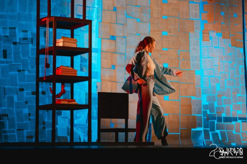 وتتعزّز هذه الرؤية الوجودية عبر سينوغرافيا تقوم على رمزية السقوط وانهيار الذاكرة. ستائر من أوراق الكتب تُحيط بالفضاء الركحي، لا بوصفها ديكورًا، بل كجسد معرفيّ هشّ، مكتبة أسطورية كاملة تُسقِطها الحركة، ويُسقِطها الجسد، كما لو أنّ المعرفة نفسها تتهاوى تحت وطأة العجز الإنساني. الكتب هنا لا تُقرأ، بل تُهدم، تتحوّل من خزّان للمعنى إلى ركام بصري، يذكّر بانكسار السرديات الكبرى أمام هشاشة الفرد. في هذا الخراب الناعم، لا يبقى سوى كرسيّ ومنضدة: بقايا يوميّة شديدة الفقر، تختزل العالم في جلستين متقابلتين بين الفراغ والانتظار، بين ما كان وما لم يعد ممكنًا. هكذا تصبح السينوغرافيا امتدادًا دراميًا للجسد، لا إطارًا له، وتتحوّل إلى مرآة أخرى لانكسار الإنسان داخل عالم يتفكّك ببطء من ورق.