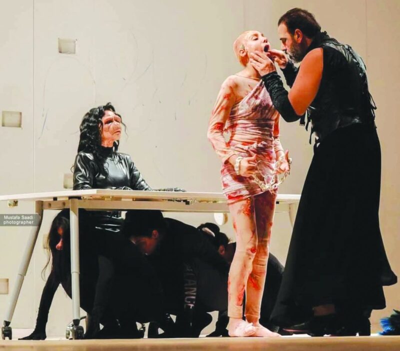 تتقاطع عناصر العنف، القتل، زنا المحارم، الشذوذ، وحكايات الاغتصاب ضمن علاقات متشابكة ومعقدة بين الشخصيات، ما يعكس صراعات القوة والضعف والتقاطع النفسي والاجتماعي للمصائر. كما يبرز المسخ الرمزي والجمالي في تحوّل الشخصيات إلى حيوانات مثل الفيل والقرد، كاستدعاء بصري وحركي للقبح والاضطراب النفسي، في انسجام مع فلسفة العدمية التي تتعامل مع الخطر الوجودي والانحراف عن المعايير. كل هذه العناصر تقدم ضمن بنية مسرحية متكاملة، تعتمد على التفاعل بين الإلقاء، الحركة، الرقص، الغناء، والموسيقى، مع استخدام الإيقاع الصوتي والحركي لتفكيك الصمت الاجتماعي وإظهار القهر النفسي، ما يتيح للجمهور تجربة فلسفية وجمالية متشابكة، تجمع بين الصدمة والقبول الفني ضمن فرضية المسرح.