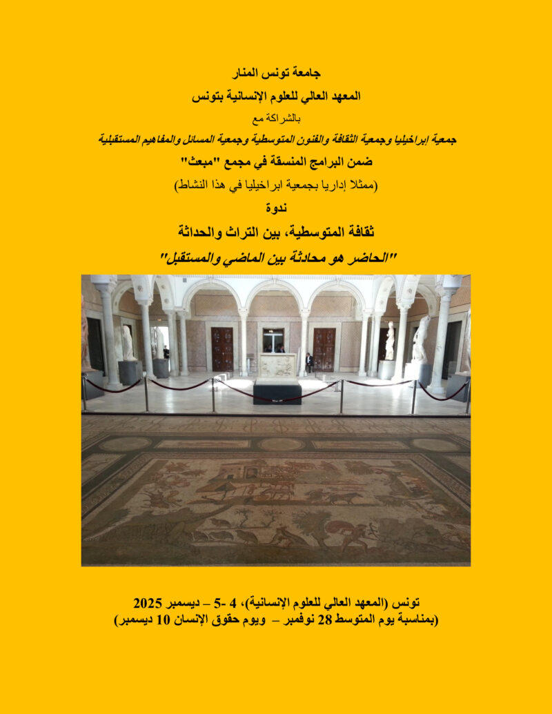 L’équipe d’organisation du colloque international du 4 et 5 décembre 2025 à Tunis (ISSHT de UTM) autour du thème “Patrimoine et Méditerranéité” se fait un plaisir de rappeler aux intéressés ar une participation en présentiel ou à distance que le dernier délai de confirmation des participations et des titres des communications est fixé au 15 novembre 2025, conformément aux indications précisées dans l’argument du colloque.
